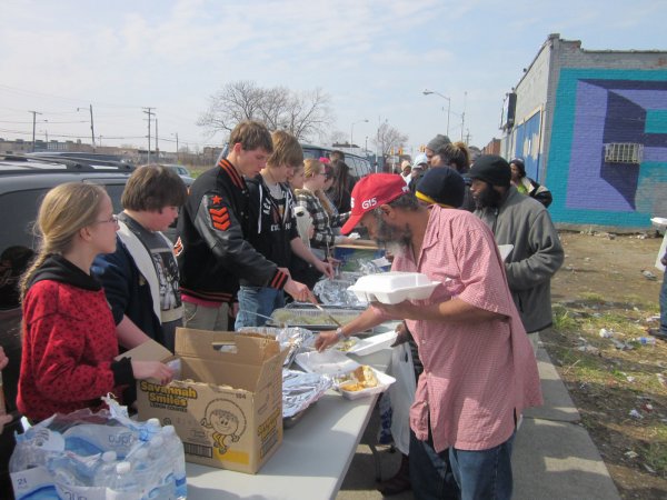 I was in for a surprise this time around. You see, we've been serving in the Cass Corridor area on a monthly basis for over a year now with the youth group. After a while you get to know some of the people that live there. I met George about a year ago while serving. George had a rough life, drug problems, and lost his home and wife. We were able to give him a meal to eat and I prayed with him afterward. What would become of him?
